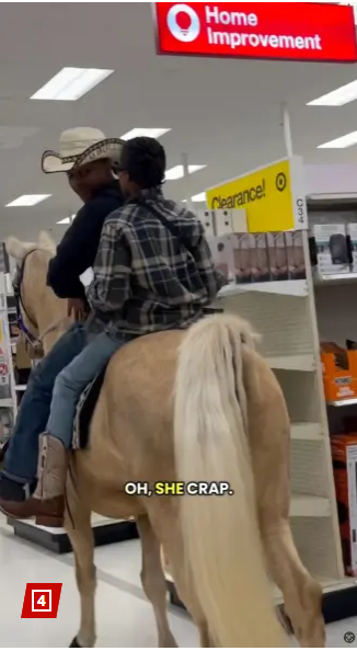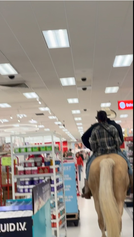 კამერამ ერთ ერთი მაღაზიის ავტოსადგომზე ცხენზე მჯდარი, კოვბოის ქუდში გამოწყობილი მამაკაცი და მისი მეგობარი დააფიქსირა. მამაკაცი ავტოსადგომზე ჯირითით შევიდა, შემდეგ კი კლასიკური ვესტერნის გმირის მსგავსად ცხოველს დეზი ჰკრა და გააჭენა, ოღონდ იმავე ფილმების გმირებისგან განსხვავებით, რომანტიკული მზის დასალიერისკენ კი არ გაემართა, გეზი მაღაზიის ავტომატური კერებისკენ აიღო და იმ რიგში ამოყო თავი, სადაც საკანცელარიო საქონელი ელაგა.