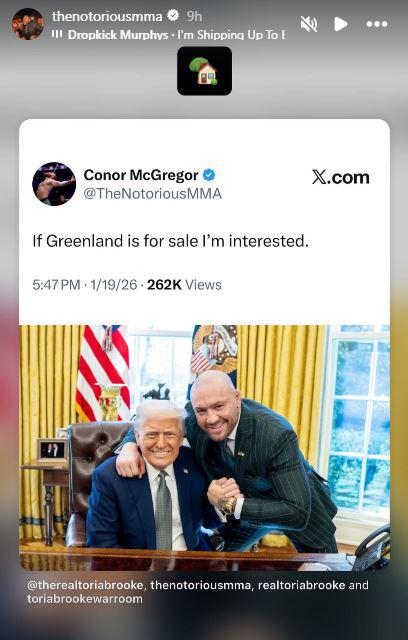 კონორ მაკგრეგორი: “თუ გრენლანდია იყიდება, მეც დაინტერესებული ვარ,“ - ასეთი აღწერით ქარდი "ინსტაგრამზე" ტელეწამყვანმა ტორი ბრუკმა გამოაქვეყნა და UFC-ის ყოფილი ჩემპიონი, კონორ მაკგრეგორი მონიშნა.