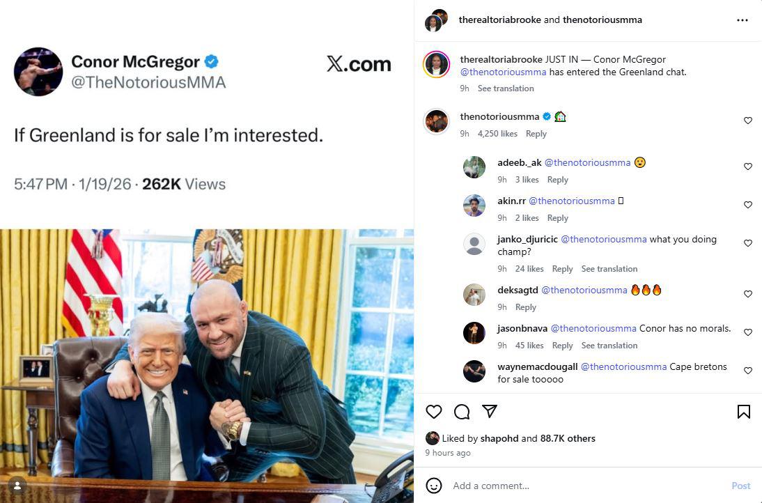 “კონორ მაკგრეგორი გრენლანდიის ჩატში შემოვიდა,“ - წერს ტორი ბრუკი.