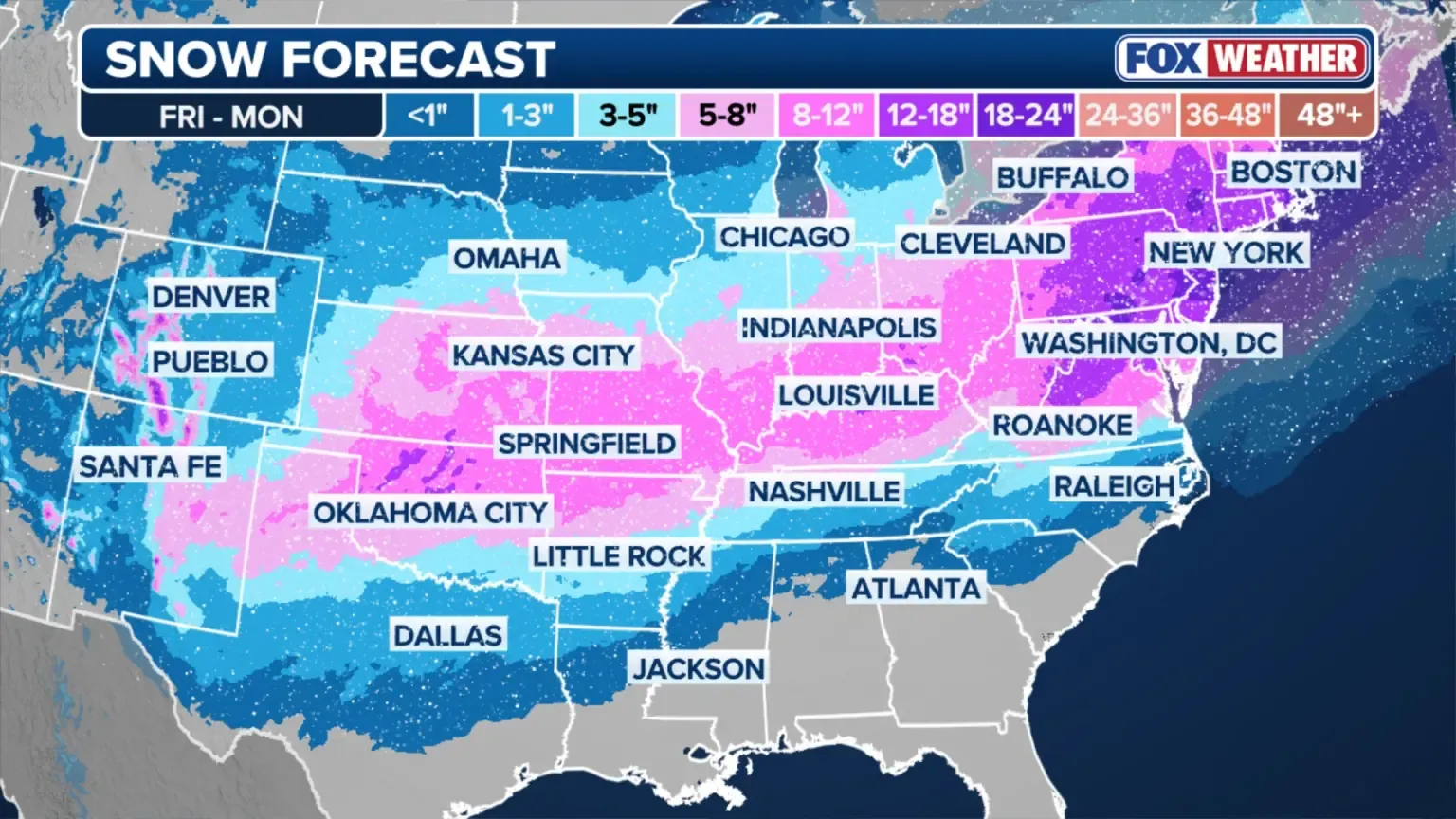 წინასწარი პროგნოზების მიხედვით, ქალაქში მოსალოდნელია დაახლოებით 20–30 სანტიმეტრი თოვლი, თუმცა ცალკეულ რაიონებში ნალექის რაოდენობამ შესაძლოა 40 სანტიმეტრსაც გადააჭარბოს. ზამთრის შტორმი დაახლოებით 35 შტატში მილიონობით ადამიანს „მნიშვნელოვან პრობლემებს“ მოუტანს, ყველაზე მეტად კი კლდოვანი მთების აღმოსავლეთით მდებარე ტერიტორიები დაზარალდება.