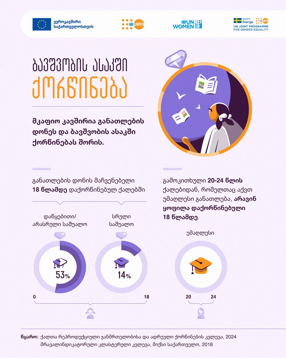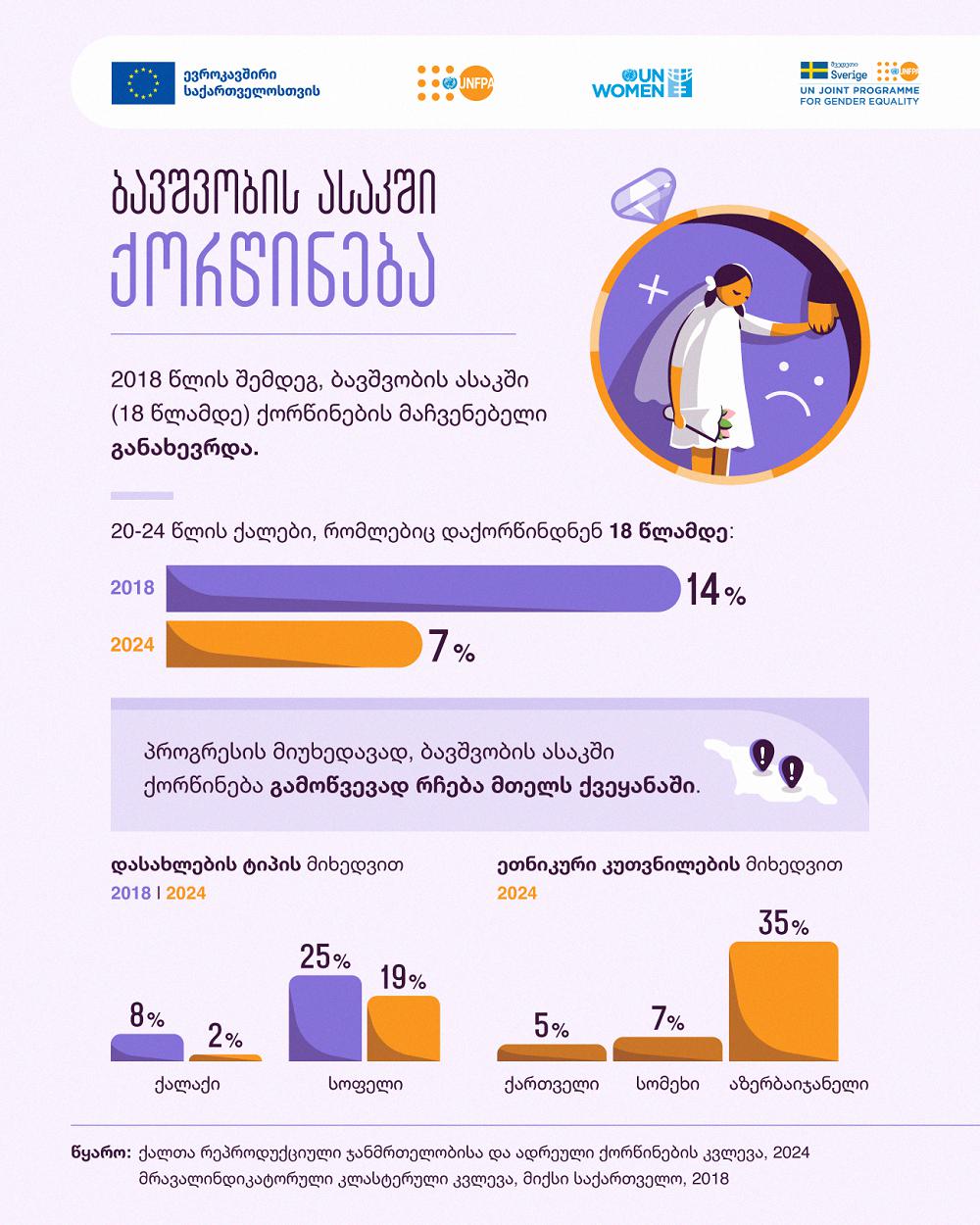 2024 წლის გამოკვლევა მოიცავს ადრეულ ასაკში ქორწინების კომპონენტსაც, რომლითაც იკვეთება, რომ 20-24 წლის ასაკის ქალებში აღნიშნული მაჩვენებელი შემცირებულია: