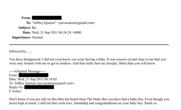 გამოქვეყნდა ასევე ელექტრონული წერილი, რომელიც 2011 წლით თარიღდება. წერილის ადრესატი ეპშტეინია, მას უინძორის ყოფილი მეუღლე, სარა ფერგიუსონი ბავშვის დაბადებას ულოცავს.