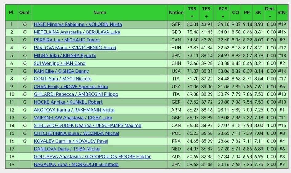 აღსანიშნავია, რომ მე-2-მე-8 აგილზე გასულ წყვილებს შორის განსხვავება ქულებში, სადღაც 4-ქულამდე მერყეობს, შესაბამისად თავისუფალ პროგრამაში გამოსვლისას შეიძლება ყველაფერი მოხდეს.