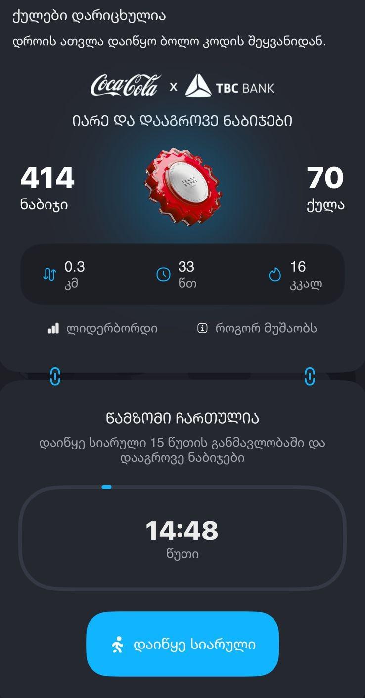 16 თებერვლიდან 13 აპრილამდე, „კოკა-კოლა ბოთლერს ჯორჯია“ და თიბისის მობაილბანკის ინვესტიციები მომხმარებლებს უნიკალურ შანსს აძლევს, გადააქციონ ყოველდღიური ნაბიჯები რეალურ ინვესტიციად. Coca-Cola Rewards Georgia-ს აპლიკაციაში ორი კომპანიის ერთობლივი ლიდერბორდი იწყება, სადაც მონაწილეები კონკურენციას გაუწევენ ერთმანეთს და გლობალური ბრენდის „The Coca-Cola Company-ს“ აქციების მფლობელები გახდებიან.