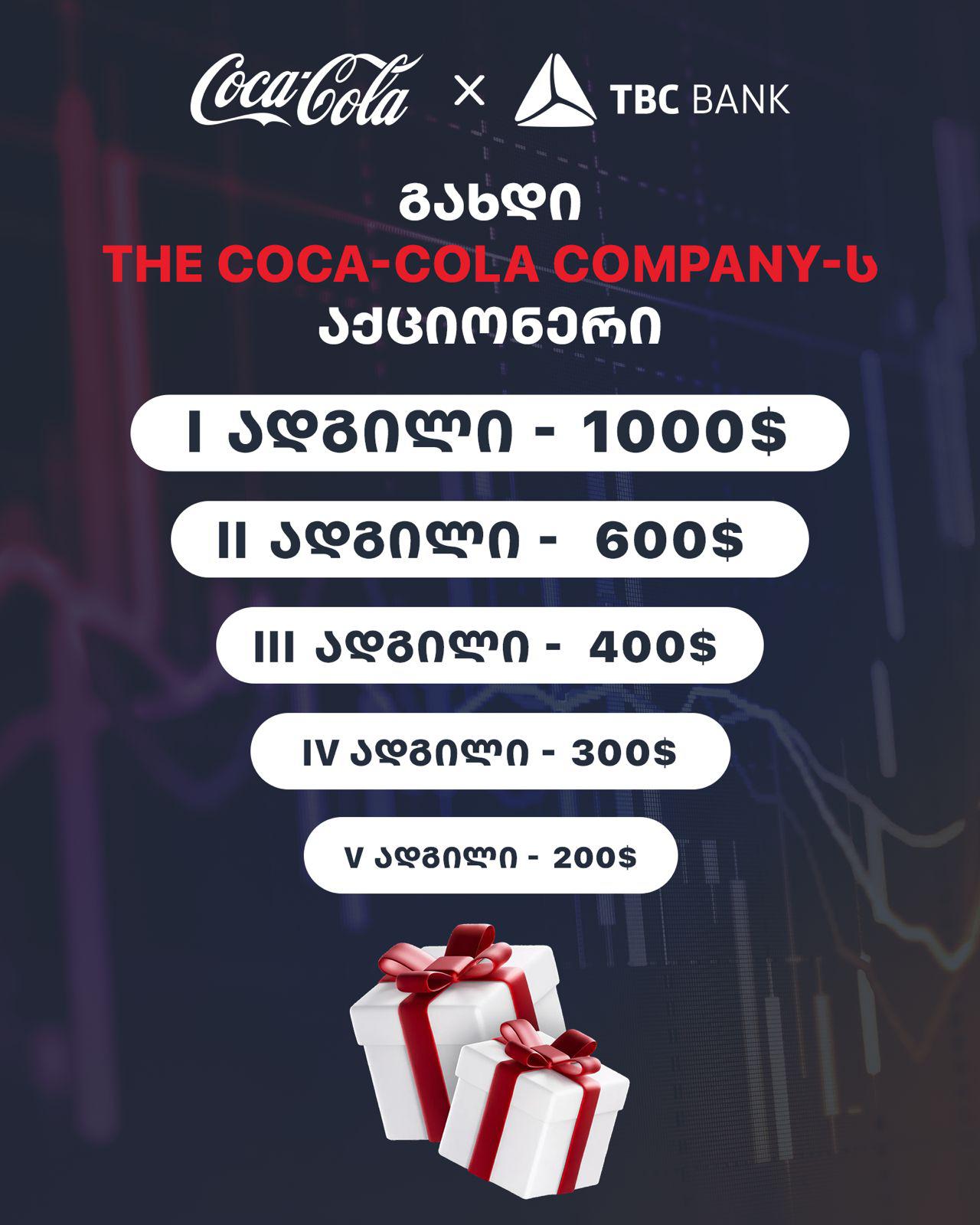 პრიზებს გამარჯვებულები The Coca-Cola Company-ის აქციების სახით, თიბისის მობაილბანკში მიიღებენ - მომხმარებლის საინვესტიციო ანგარიშზე.