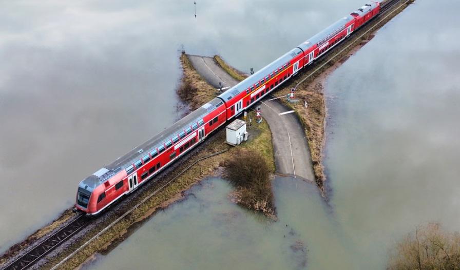 ფოტოზე დატბორილ მინდვრებს შორის მიმავალი რეგიონული მატარებელი ჩანს. ფოტოს ავტორია მაიკლ პრობსტი.