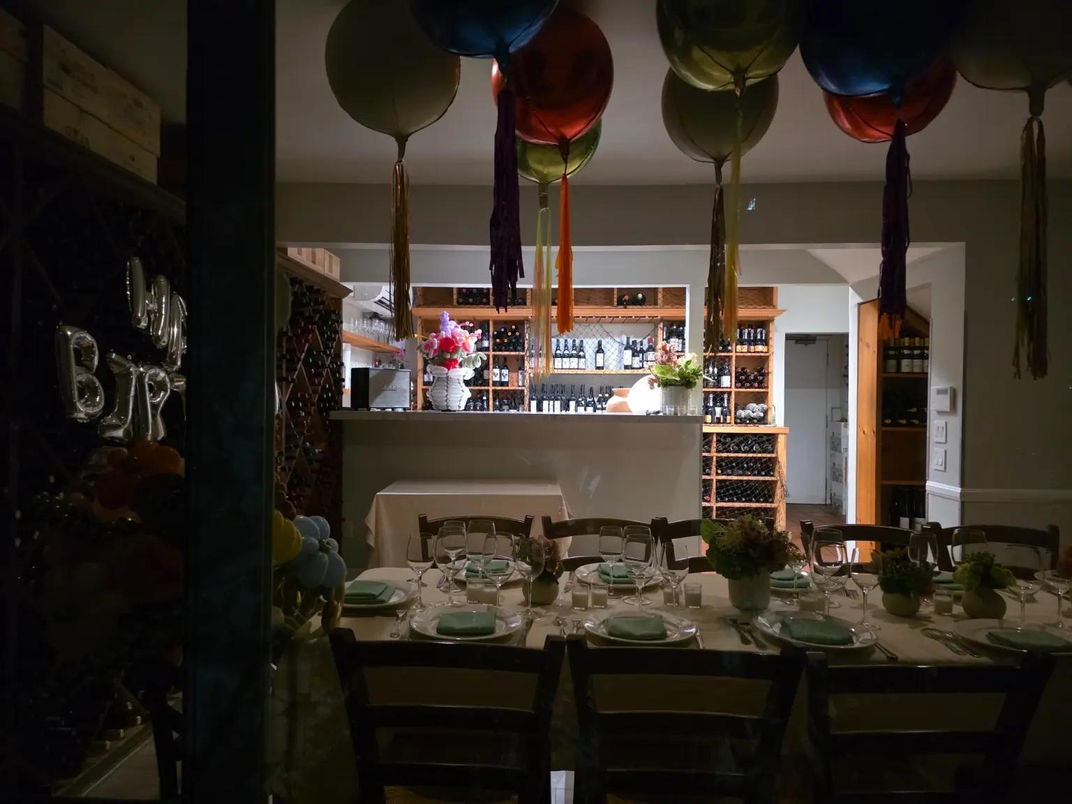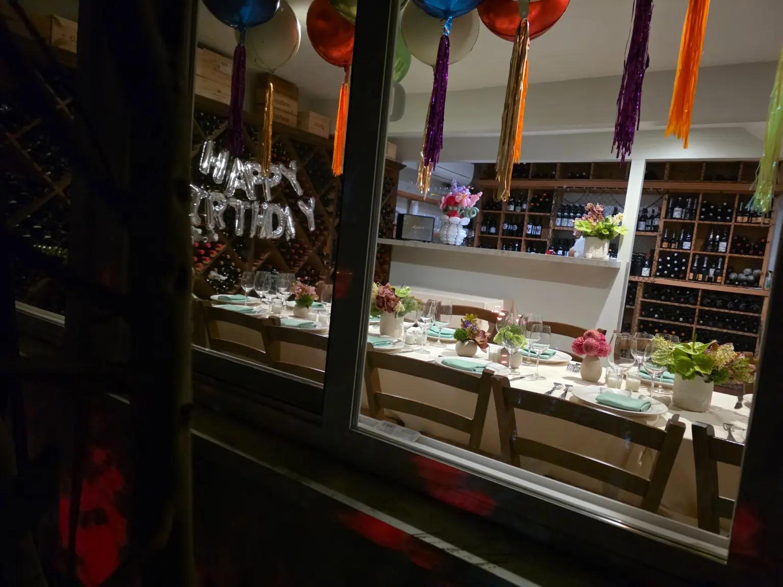 რესტორანში განცალკევებით მოწყობილი ოთახი ფერადი ბუშტებით და დაბადების დღის მისალოცი ტექსტებით იყო მორთული.