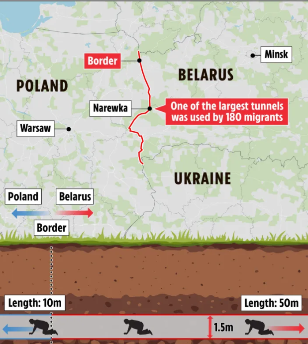 ერთ-ერთი ყველაზე დიდი გვირაბი ჩრდილოეთ პოლონეთში, ნარევკას მახლობლად აღმოაჩინეს. ბელარუსმა 60-მეტრიანი მიწისქვეშა გასასვლელით 180 მიგრანტის გადაყვანა სცადა, თუმცა მათი უმეტესობა პოლონეთში გამოსვლისას დააკავეს.