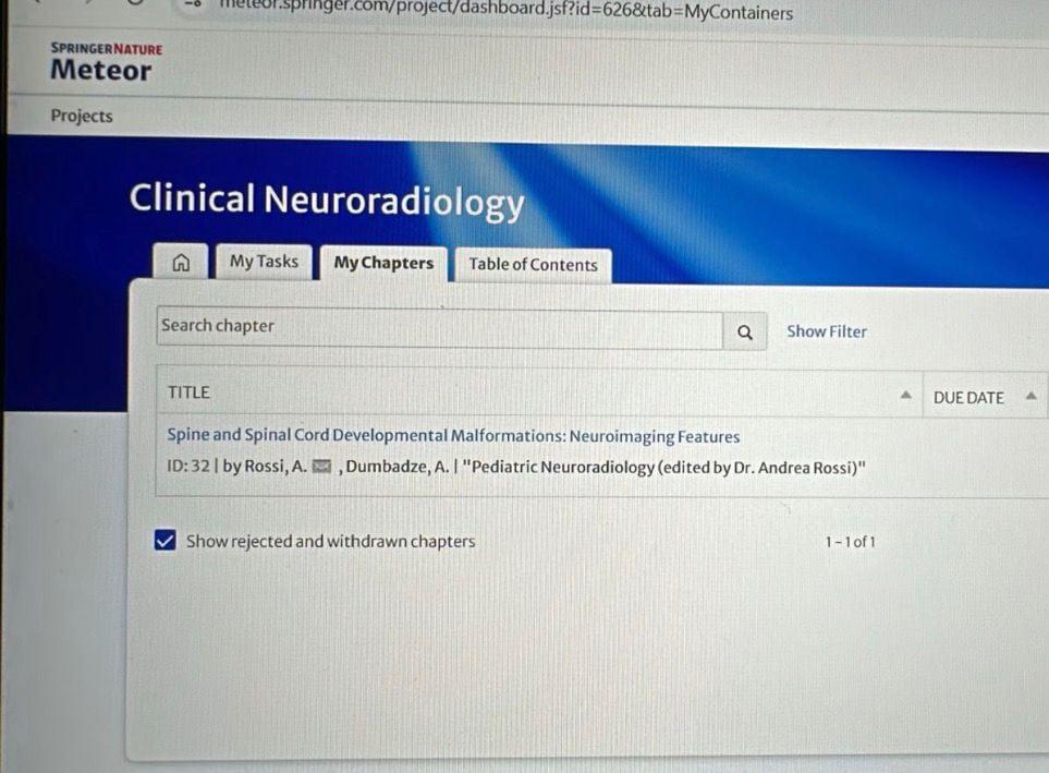 ნაშრომის თავი დასათაურებულია შემდეგნაირად: „ხერხემლის და ზურგის ტვინის განვითარების მალფორმაციები: ნეირორადიოლოგიური მახასიათებლები (spine and spinal cord developmental malformations: neuroimaging features)“. ეს ეხება ხერხემლისა და ზურგის ტვინის განვითარების მალფორმაციებს და მათ ნეირორადიოლოგიურ მახასიათებლებს. მასში განხილულია ნერვული მილის განვითარების დარღვევებთან დაკავშირებული სხვადასხვა ტიპის თანდაყოლილი ანომალია, მათი ემბრიოლოგიური საფუძველი და კლასიფიკაცია. ყურადღება ეთმობა თანამედროვე გამოსახულებითი მეთოდებით, განსაკუთრებით მრტ-ით, ამ პათოლოგიების იდენტიფიკაციასა და შეფასებას.