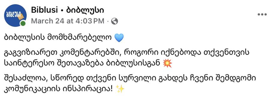 აქცია შემთხვევითი არ არის. 24 მარტს "ბიბლუსმა" სოციალურ ქსელში, ოფიციალურ გვერდზე, გამოაქვეყნა პოსტი: "ბიბლუსის მომხმარებელო, გაგვიზიარე კომენტარებში, როგორი იქნებოდა თქვენთვის საინტერესო შეთავაზება ბიბლუსისგან?