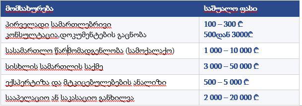 - სამართლებრივი კონსულტაციისა და ადვოკატის მომსახურების ღირებულება საქართველოში დამოკიდებულია საქმის სირთულეზე, ადვოკატის კვალიფიკაციასა და ინსტანციაზე, ადვოკატის გამოცდილებაზე, ცნობადობასა და ბაზარზე მოთხოვნილებაზე