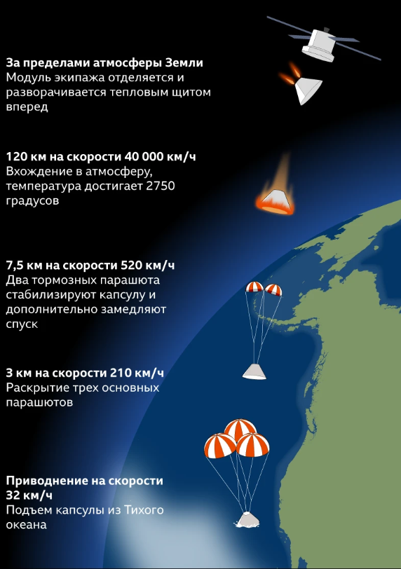 დაშვებისას ეკიპაჟს ძლიერი რყევებს შეიგრძნობს, თუმცა ისინი უნიკალურ სანახაობის მომსწრენი გახდებიან, მათი კაფსულა გავარვარებული პლაზმისა და ცეცხლის გარსში გაეხვევა, რის დროსაც ასტრონავტები დაახლოებით 6 წუთით დაკარგავენ კავშირს მისიის ცენტრთან.