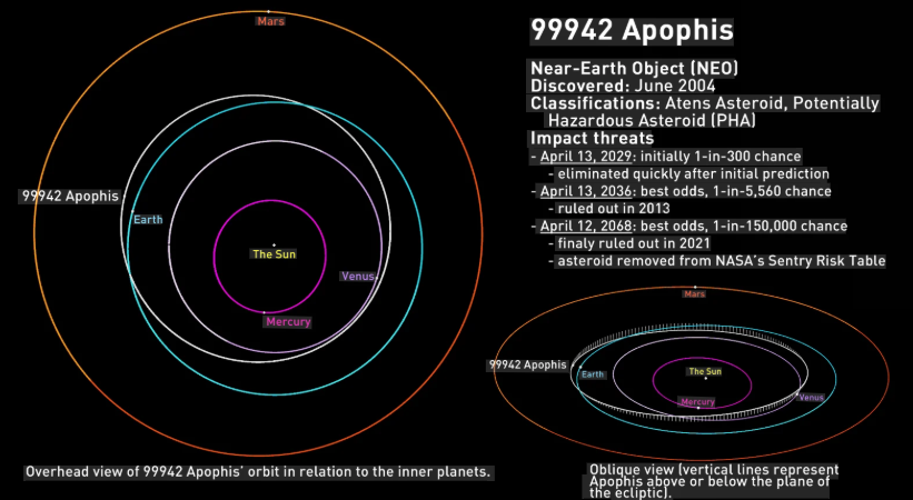 “აპოფისი“ პირველად 2004 წელს აღმოაჩინეს, მკვლევრები თავდაპირველად მისი დედამიწასთან შეჯახების 2,7 % რისკზე საუბრობდნენ, თუმცა 2021 წლის ჩატარებულმა დაკვირვებებმა ეს საფრთხე საბოლოოდ გამორიცხა და ასევე დაადგინა რომ მომდევნო 100 წლის განმავლობაში ჩვენს პლანეტას მსგავსი საფრთხე არ ემუქრება.