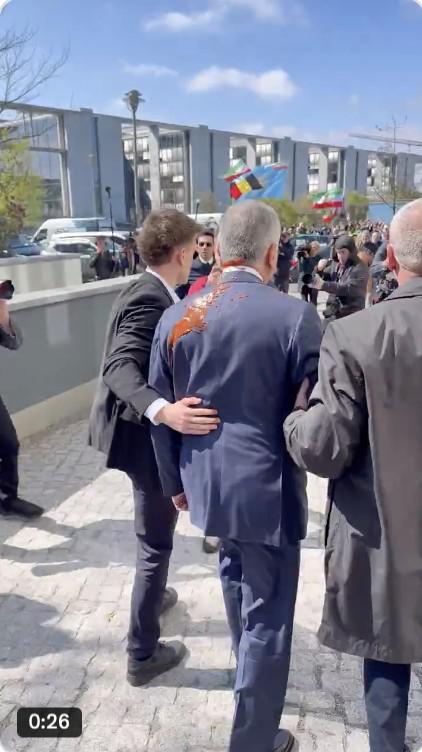 მედიაში ვრცელდება ვიდეო კადრებიც, სადაც ჩანს, როგორ ასხამს აქტივისტი ირანის პრინცს სითხეს. როგორც მედია წერს, აქტივისტი ფეჰლევს ირანის ომის შესახებ, მისი პოზიციის გამო დაუპირისპირდა