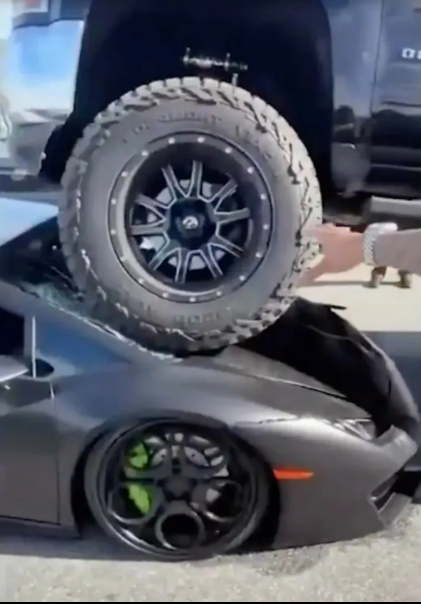 შოკისმომგვრელ ვიდეოში ჩანს, გიგანტური ავტომობილის სიმძიმის ქვეშ “Lamborghini Huracán“-ი წამებში გაიჭყლიტა, პიკაპის მძღოლმა უკან დახევა სცადა, თუმცა უშედეგოდ, რის შემდეგაც პანიკაში ჩავარდნილი მანქანიდან გადმოხტა და თავში ხელები წაიშინა.